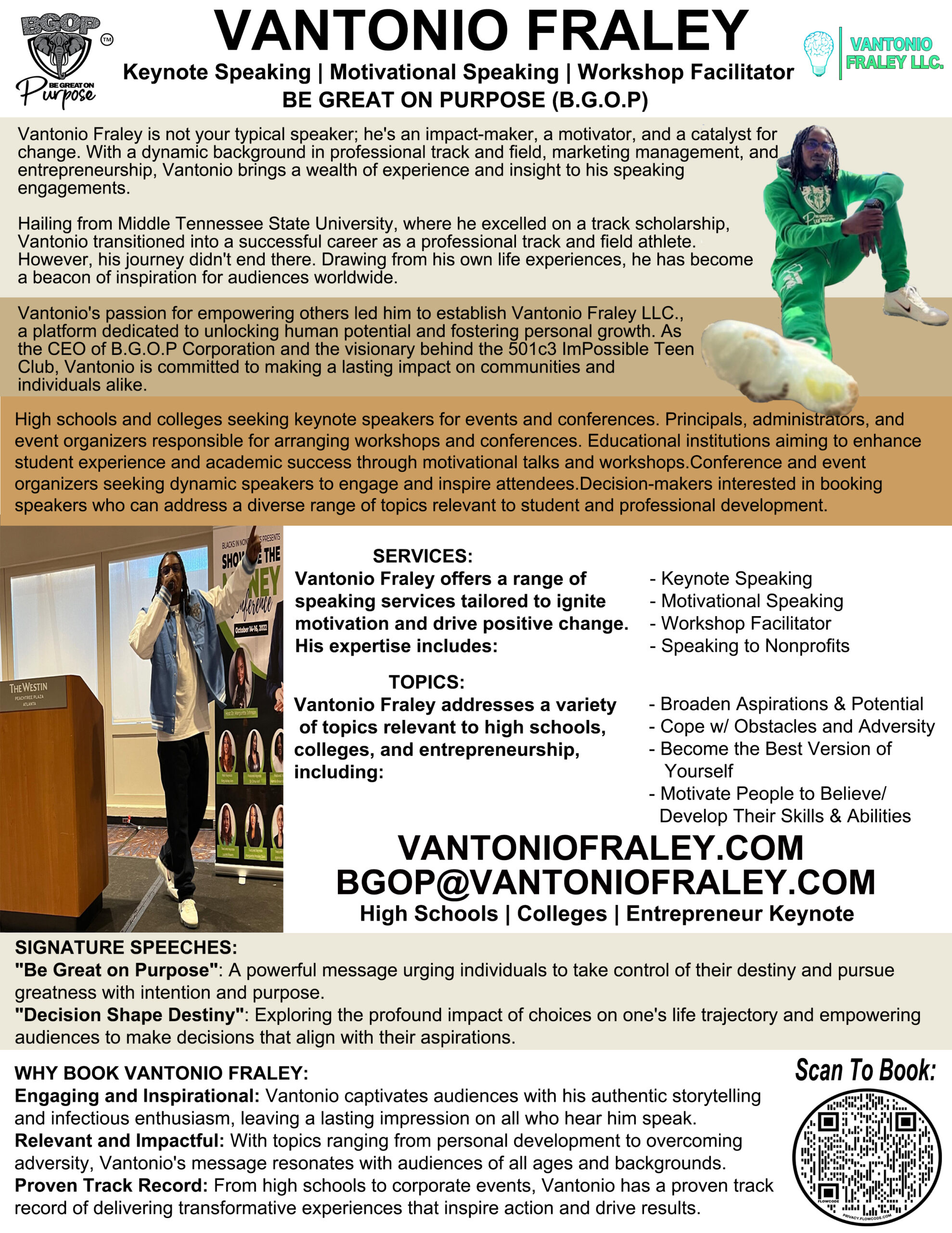 Vantonio BeGreat OnPurpose Fraley is a dynamic motivational speaker, keynote speaker, nonprofit/business consultant, and marketing strategist dedicated to inspiring individuals and organizations to achieve greatness. With a diverse background in athletics, marketing, and entrepreneurship, Vantonio brings a unique perspective and wealth of experience to his speaking engagements and consulting services.
